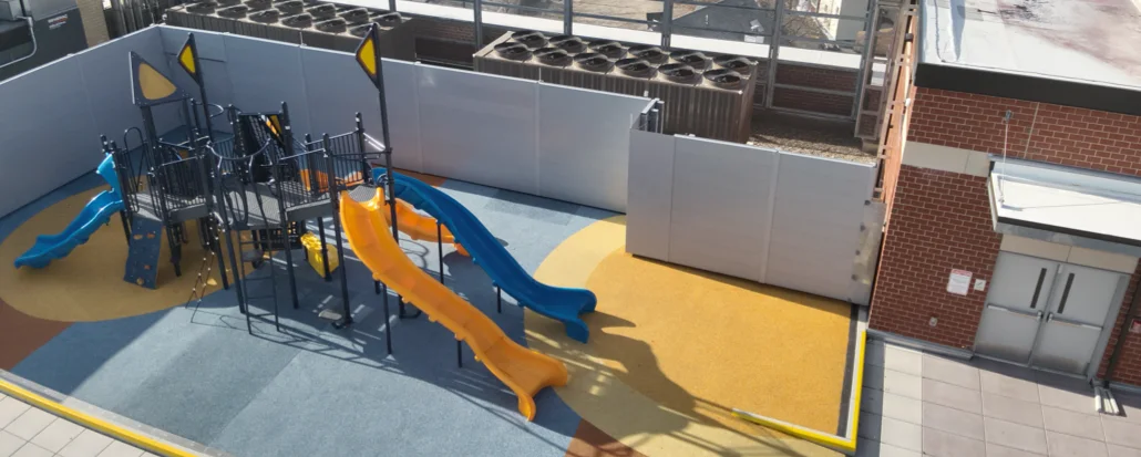 The Hydrotech assembly is topped with pavers and specialty play surfaces that provide space for a general play area, basketball court, jungle gym, slides, and a lounge zone. Hydrotech Monolithic Membrane 6125 was chosen for its proven durability beneath heavy overburden. In an application where the roof must handle groups of energetic children as well as harsh New England winters, long-term performance was critical.
